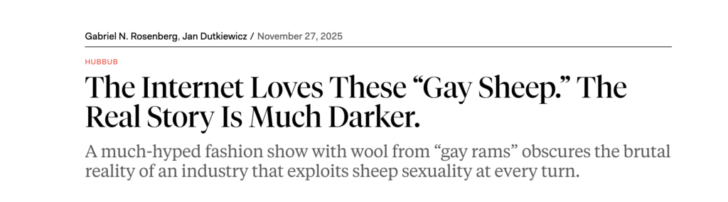 We’re so far removed from the conditions that allow us to have our little prepackaged lifestyles that we can sit around and write 2000 words about sexually exploited sheep for The New Republic and probably get paid for it. To stir outrage for the engagement vectors our wee oligarchs need to continue the social experiments that end up making us pretend to give a damn about gay sheep. It’s amazing, really, how staggeringly stupid we’ve become despite everyone having a college degree these days.