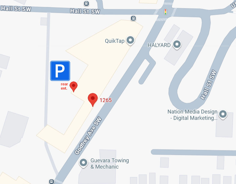 Entrance at the back of the warehouse with free parking on Hall Street, or in the main lot as long as you don't block the trucks.